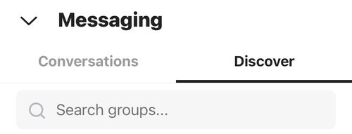 The title of the screen should read "Messaging". From here you have two options, you may Discover a new group or you may look for your active Conversations. The two tab options are shown at the top of the page. Select Conversations (see below):